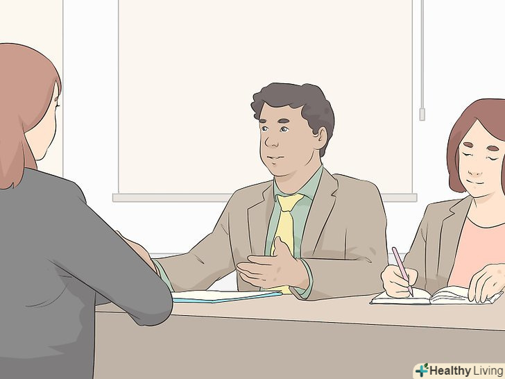 При зустрічіВстановіть зоровий контакт з рекрутером . зоровий контакт продемонструє рекрутеру, що ви його слухаєте, і допоможе встановити взаєморозуміння. Крім того, він покаже, що ви володієте непоганими комунікативними навичками. Підтримуйте зоровий контакт як під час привітання, так і в ході подальшого спілкування. [12]- Якщо вам важко підтримувати зоровий контакт, спробуйте відпрацювати його на власному відображенні в дзеркалі або порепетируйте з другом або родичем.