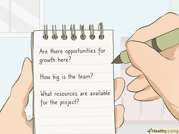 Складіть список з 5-10 потенційних питань, які ви можете задати рекрутеру. питання рекрутеру з Вашого боку демонструють вашу зацікавленість в роботі і показують, що ви приділили час підготовці до співбесіди. Грунтуючись на зібраній вами інформації та вимогах до претендента вакансії, підготуйте 5-10 потенційних питань, які ви зможете задати під час співбесіди. Запишіть ці питання, щоб у вас в пам'яті залишилося хоча б кілька їх варіантів до того моменту, коли ви будете проходити співбесіду. [6]- Наприклад, можна задати наступні питання « " Чи є тут можливості для кар'єрного росту? Наскільки велика ваша команда? Які доступні ресурси для виконання даного проекту?»