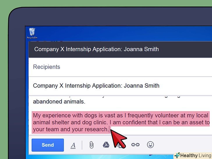 Розкажіть про свою кваліфікацію та досвід. Розкажіть в декількох пропозиціях про курсові проекти і попередній досвід роботи, а також про наявність будь-яких важливих для виконання даної роботи навичок. Продемонструйте, як Ваші знання можуть принести користь організації. Додайте інформацію про робочу та волонтерську діяльність, а також поясніть, як набутий раніше досвід підготував вас до проходження стажування. Підкресліть, яким чином ви зможете внести свій внесок у вдосконалення і розвиток організації. Ваш потенційний роботодавець повинен повірити в те, що Ви зможете впоратися з поставленими завданнями. [8]- Описуйте свій трудовий досвід за допомогою сильних виразів з дієсловами. Замість того, щоб писати: «я стажувався у відділі маркетингу протягом двох років», — голосно заявіть про себе: «будучи стажистом у відділі маркетингу, я створював оригінальний і свіжий контент, розробляв електронні та друковані версії рекламних проспектів, а також розвивав ринок збуту за допомогою соціальних мереж для організації чисельністю п'ятдесят чоловік». [9]