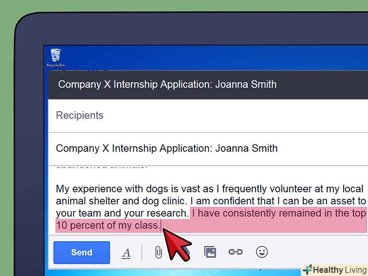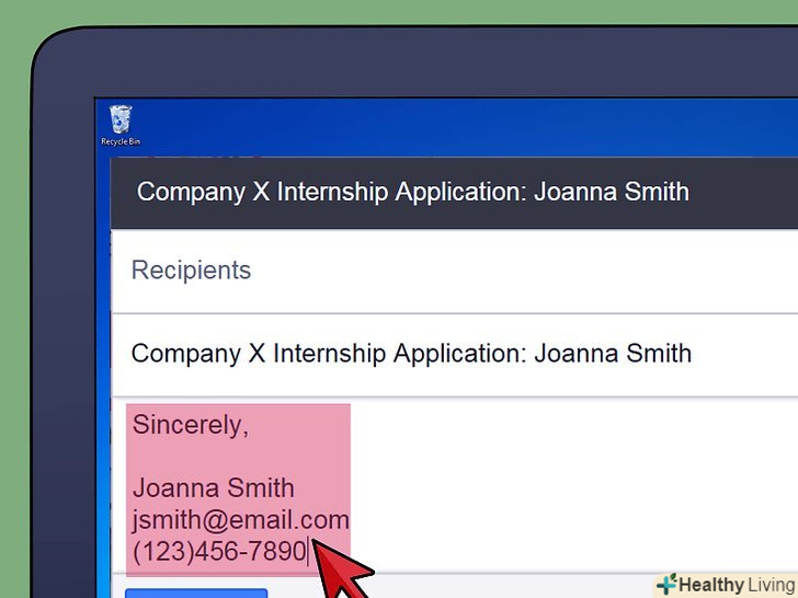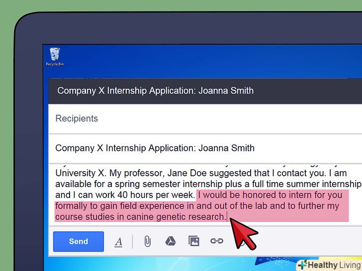 Подумайте про вкладення до листа. не прикріплюйте своє резюме до незапрошеного адресатом електронного листа з приводу влаштування на стажування. Якщо компанія не займається активним пошуком стажистів, то співробітники можуть не захотіти відкривати вкладення (особливо в тому випадку, якщо це суперечить їх правилам інформаційної безпеки на робочих місцях). Якщо в рекламній брошурі просять надіслати резюме, то прикладіть до листа документ у форматі PDF (а не Word, де форматування може бути втрачено/змінено під час відкриття на іншій операційній системі).- Деякі роботодавці іноді попереджають, що вони не відкривають вкладення до електронних листів. Якщо ви з цим зіткнетеся, то додайте в текст електронного листа свій супровідний лист і резюме. Простежте, щоб вони були відокремлені один від одного пробільними рядками: так роботодавцю буде простіше відрізнити кожен документ.