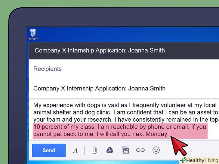 Вкажіть, коли ви будете доступні для контакту. обговоріть, коли і як ви будете звертатися до роботодавця для того, щоб відстежувати статус вашої заяви. Залиште свою контактну інформацію: ім'я, адресу електронної пошти, номер телефону і вкажіть час, коли ви буваєте доступні. Ви могли б написати: "зі мною можна зв'язатися як по телефону, так і по електронній пошті. Якщо ви не зможете зв'язатися зі мною, то я передзвоню вам (наступного понеділка)"»
