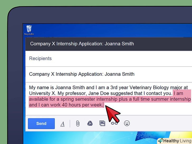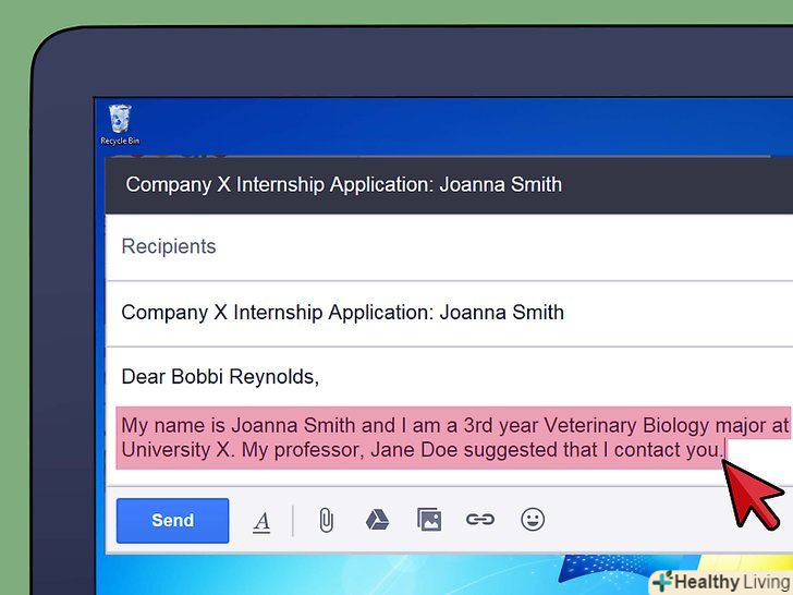 Представтеся. повідомте одержувачу своє ім'я та статус (наприклад, студент третього курсу, який вивчає біологію в університеті X). Вкажіть, як ви дізналися про стажування (знайшли онлайн, прочитали в газеті або дізналися від знайомих). Якщо у вас є спільні знайомі, то розкажіть про це якомога швидше. Наприклад, ви могли б написати " керівник програми .../ мій професор / і так далі... ", потім вказати точне місце роботи, посаду та ім'я, «запропонував мені зв'язатися з вами».
