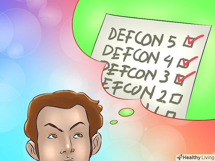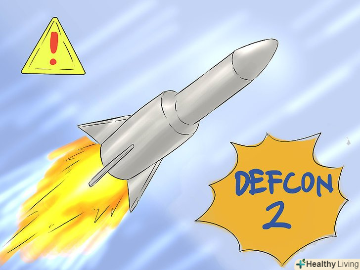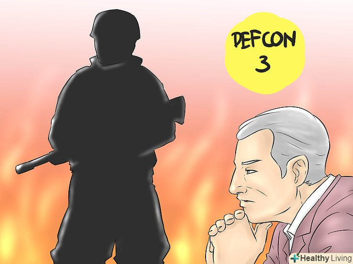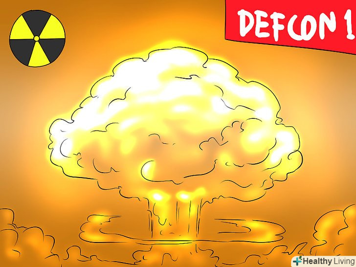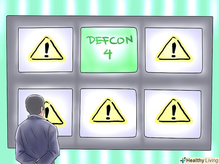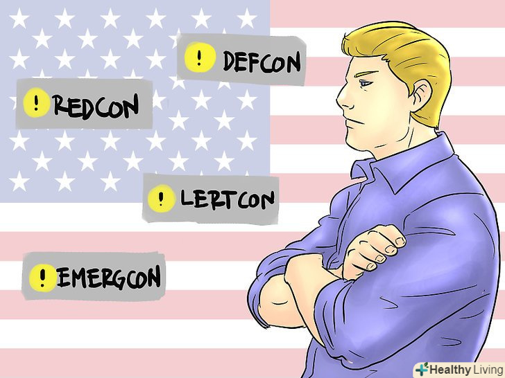 Навчіться читати шкалу DEFCON. Шкала DEFCON-це спосіб вимірювання числової величини готовності американських військ. Високі показники DEFCON використовуються при низькому рівні готовності (в мирний час), а більш низькі показники DEFCON – при більш високому рівні готовності (в напружених ситуаціях, коли є ймовірність військового втручання). 5 Рівень DEFCON відповідає звичайному мирному часу, а 1 рівень DEFCON (який поки не спостерігався) відповідає найбільш небезпечним ситуаціям, таким як термоядерна війна.- Зауважте, що різним військовим формуванням можуть відповідати різні рівні DEFCON. Наприклад, під час Карибської кризи, який зазвичай вважається одним з найбільш напружених моментів в американській військовій історії, стратегічне авіакомандування ВПС перейшло на 2 рівень за шкалою DEFCON, в той час як інші війська залишилися на 3 рівні DEFCON. [2]