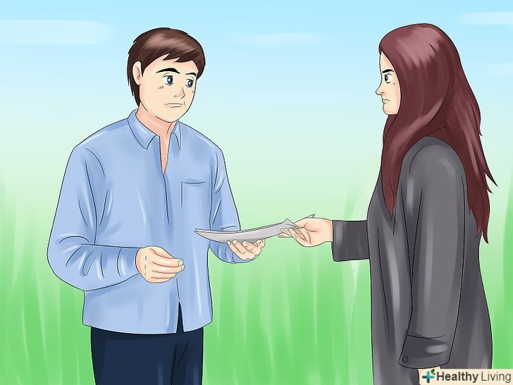Передати документи безпосередньо відповідачу. судовий виконавець повинен особисто передати копію судового протоколу відповідачу. Він або вона повинні прийти до відповідача, сказати йому " це судові документи» і передати копії всіх документів, що мають відношення до вашої справи.- Відповідач може відмовитися прийняти документи. Якщо це сталося, судовий виконавець повинен покласти документи біля нього і піти. Вчинивши так, він задовольнить вимоги суду, навіть якщо відповідач відмовиться прийняти документи або викине їх.