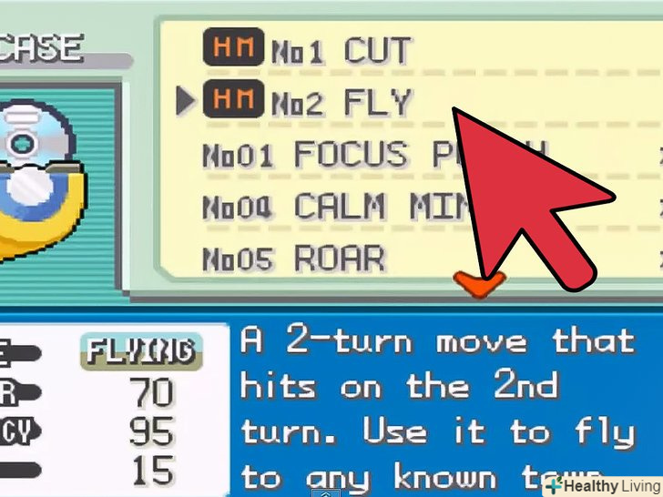 Відкрийте сумку і перейдіть в розділ «Key Items» (важливі предмети).натисніть на «TM Case», а потім виберіть зі списку «FLY». Натисніть В меню на кнопку " Use " (застосувати).