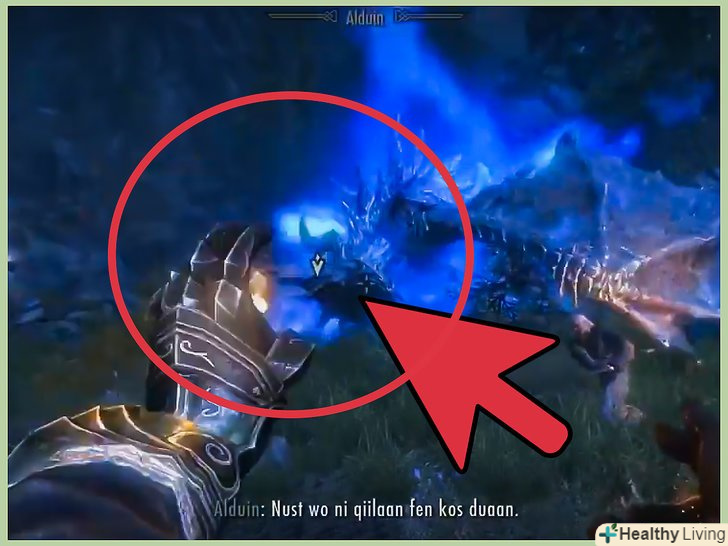 Не підходьте до Алдуїна спереду.як тільки Алдуїн опиниться на землі, він атакує вогняним диханням, яке завдає багато шкоди всім, хто стоїть перед пащею, а також потужними ударами хвоста ззаду. Спробуйте атакувати дракона з боків, який би у вас не був стиль бою (далекий/ближній).- Зрештою дракон повернеться, щоб вкусити вас (ви знову опинитеся перед пащею), так що продовжуйте рухатися вбік.