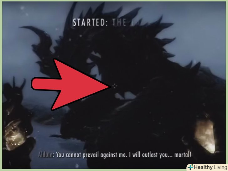 За допомогою Драконобоя збийте Алдуїна на землю. Натисніть і утримуйте клавішу крику, щоб атакувати. Слідкуйте за допомогою ігрової камери за польотом Алдуїна, поки діє крик, щоб не промахнутися. Якщо ви промахнетеся, вам доведеться почекати, поки крик не перезарядиться.- Одягніть Амулет Талоса, щоб час перезарядки крику скоротилося.