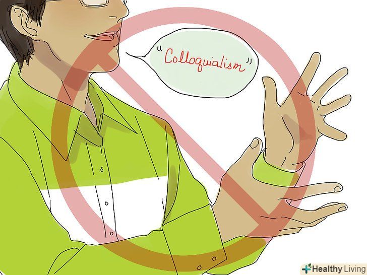 Постарайтеся не використовувати занадто багато розмовних виразів. використовуючи таку мову, ви будете виглядати "неприродно" і люди подумають, що ви не володієте нормальною мовою. Говоріть нормально, чітко і впевнено, а якщо є відповідний момент, то можна використовувати більш формальну мову і багатоскладові слова. Однак не перестарайтеся, інакше люди подумають, що ви занадто гордовитий, що так само погано, як і виглядати неприродно.- Важливо знайти правильний баланс в розмові, так ви будете виглядати розумним і досить витонченим в присутності друзів.