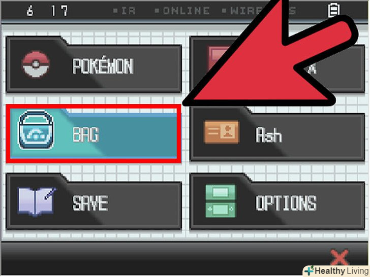 Відкрийте вашу сумку.натисніть на кнопку Start і пересувайте стрілками на опцію"Bag".- Натисніть на кнопку A, щоб відкрити вашу сумку.