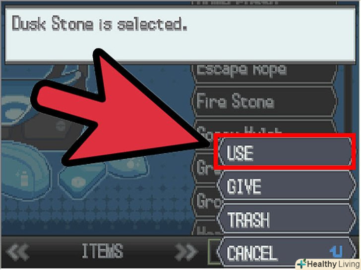 Виберіть Dusk Stone.використовуйте стрілки, щоб пересуватися по вмісту вашої сумки. Наведіть на Dusk Stone і натисніть на A; з'явиться список покемонів вашої групи.