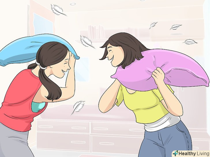 Багато рухайтеся. якщо ви будете продовжувати рухатися, організм буде не спати, і ваша активність збільшиться. Спробуйте виконати різножку (стрибки на місці зі зміною положення рук і ніг) або віджимання, щоб позбутися від сонливості. Грайте з приятелями по вечірці в рухливі ігри, замість того щоб просто засісти з приставкою і дивитися телевізор. [8]- Влаштуйте бій подушками! Це дозволить вам всім зберегти активність і повеселитися. Якщо ви вирішите влаштувати бій подушками, намагайтеся вести себе якомога тихіше або робіть це там, де немає відлуння!