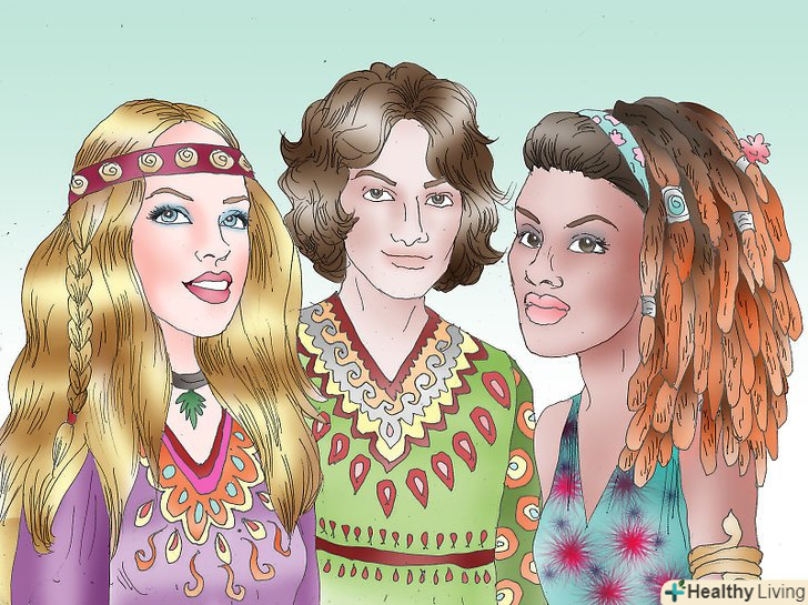 Роздобудьте відповідний одяг. або не робіть цього. Одяг-необов'язковий елемент культури хіпі. Хіпі не переживають через матеріальне. Філософія хіпі повинна проявлятися у ставленні до світу, а не в одязі. Тому не потрібно обходити всі магазини секонд-хенд в пошуках "правильних" круглих окулярів з рожевими стеклами, розкльошені штанів або майок-варенок . Пошукайте будь-яку недорогий одяг в звичайному магазині. Якщо одяг яскравий, а вам комфортно, ці речі підійдуть.- Носіть речі з натуральних матеріалів, особливо з конопляного волокна. Конопля виробляє велику кількість кисню. Яскраве пончо і одяг в мексиканському стилі, зроблена з конопляних тканин, також відповідає образу хіпі.