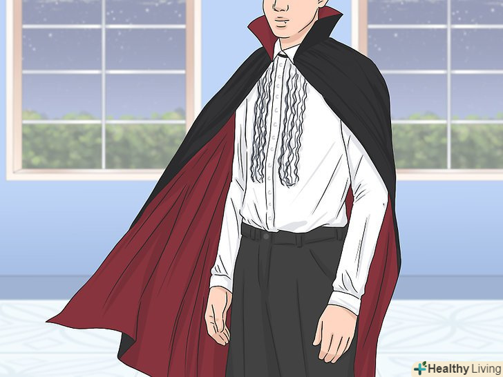 Виберіть елегантний наряд. якщо хочете, щоб ваш костюм справив враження на всіх, надіньте щось елегантне і злегка старомодне. Чоловікам підійде сорочка з оборками на грудях, чорні штани і чорне взуття. Можна підв'язати пояс-шарф, якщо вам подобається цей елемент одягу. Жінкам можна підібрати елегантну блузку і довгу струмливу спідницю – вони будуть відмінно поєднуватися з іклами і накидкою. Не забувайте, що речі повинні бути темних кольорів. [9]