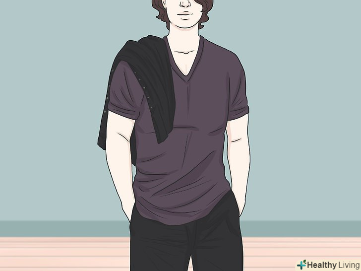 Носіть темний одяг. вампіри носять темні тони. Вибираючи одяг, відмовтеся від яскравих, пастельних кольорів і всього блискучого. Краще вибрати однотонні темні речі, адже ви повинні виглядати як нічне створення, а не як модель з вітрини магазину з одягом.- Уникайте одягу з логотипами і сорочок з великим малюнком. Для образу вампіра там буде потрібно чорна майка і чорні джинси.