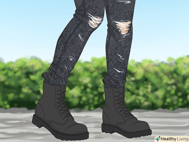 Підберіть відповідне взуття. як правило, вампіри не носять тенісні туфлі або кросівки. Вони вибирають класичне взуття.- Хлопцям найкраще носити масивне взуття. Можна купити класичні туфлі з грубої шкіри на товстій підошві або високі чорні робочі черевики. Підійде і взуття Dr Martens.