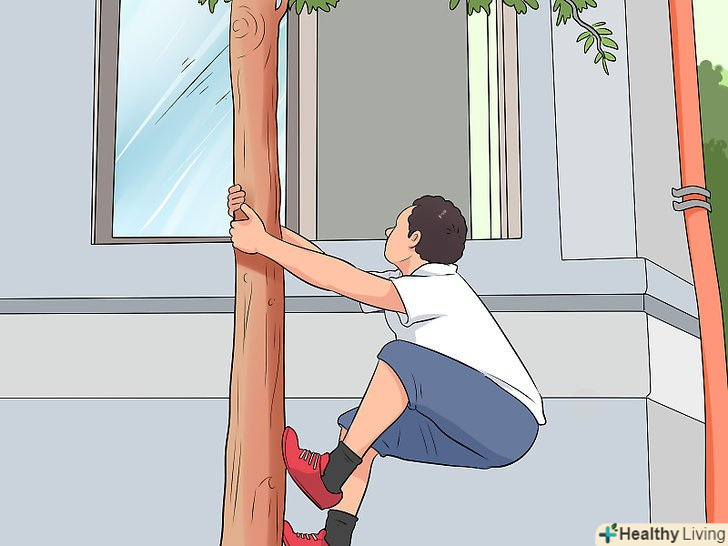 Спустіться по дереву, якщо воно є біля вікна вашої спальні. вам пощастило, якщо поруч з вікном вашої спальні є дерево, тому що воно послужить в якості «вбудованого» маршруту для втечі. Просто відкрийте вікно і заберіться на найближчу гілку дерева. Потім продовжуйте спускатися по стовбуру.- Якщо ви плануєте часто здійснювати пагони, можливо, буде гарною ідеєю прикріпити до дерева кілька сходинок, по яких буде зручно спускатися і підійматися. Для цього можна просто прибити до стовбура невеликі напиляні бруски. Використовуйте їх в якості сходинок, щоб підніматися і спускатися по стовбуру дерева. [5]