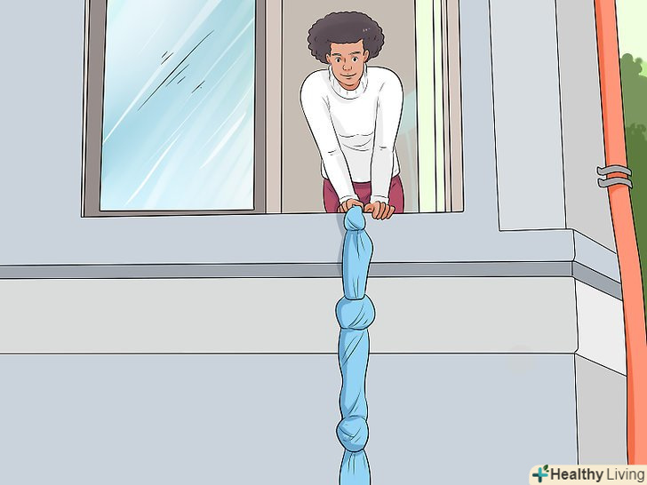 Зробіть мотузку з простирадлом. візьміть кілька простирадлів (приблизно 3-4), зв'яжіть разом і простягніть від вашої спальні до землі. Беріть по одній простирадлі і щільно скручуйте уздовж. Потім зробіть кілька вузлів на кожному простирадлі і зв'яжіть їх разом. Двічі щільно перев'яжіть кожен вузол, щоб ваша мотузка з простирадлом не розв'язалася. [4]