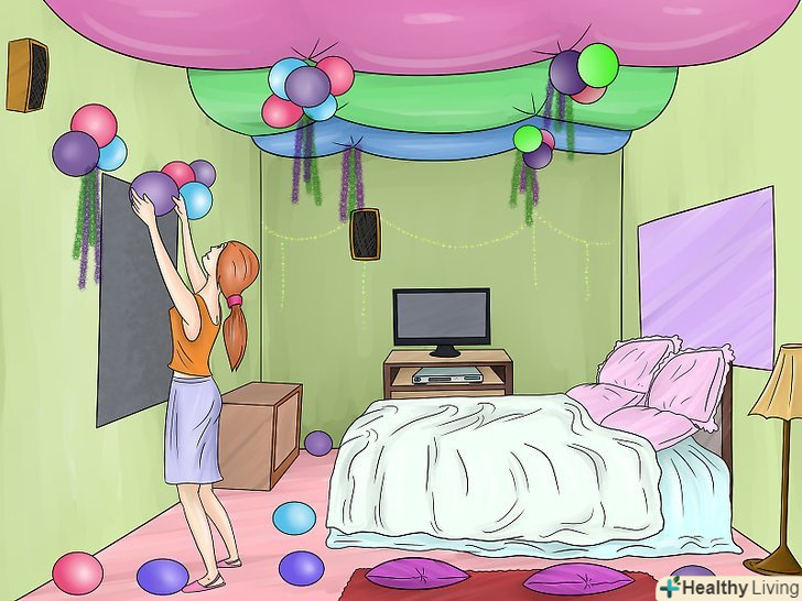 За бажанням можна прикрасити будинок. Якщо у вас тематична вечірка, зробіть відповідне оформлення кімнати, в якій будете спати.- Закрийте вікна чорним обгортковим папером. Розвісьте лампи мерехтливого світла по всьому простору проведення вечірки. Розкидайте по підлозі надувні кульки своїх улюблених квітів.