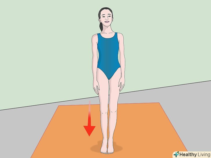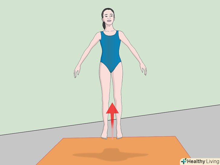 Встаньте прямо. зведіть ноги разом, шкарпетки повинні вказувати вперед. Підніміть руки вгору над головою.- Стрибок вгору з прямим тілом – це досить проста вправа, яке можна виконувати вдома. Воно допоможе вам зміцнити м'язи ніг, поліпшить кардіоваскулярну витривалість і навчить вас тримати рівновагу.