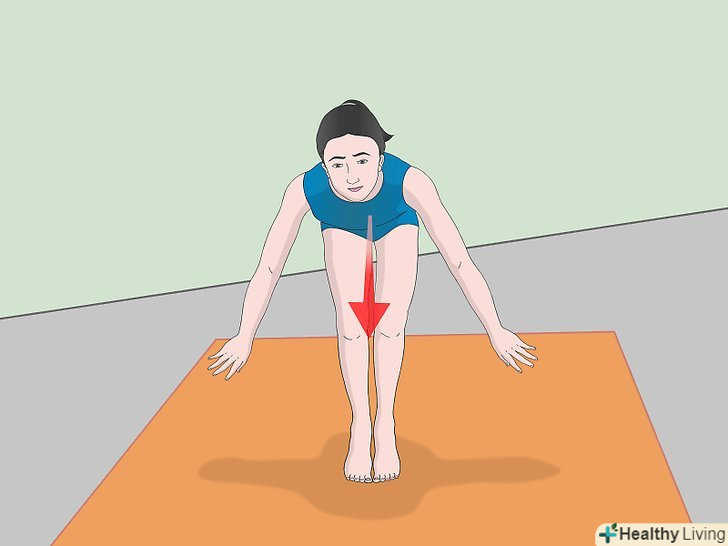 Закінчіть блискучим фіналом. гімнасти придумали цю фразу Для опису методу приземлення, який поглинає удар і запобігає пошкодження. Для цього ваші ноги повинні знаходитися на невеликій відстані один від одного, а коліна – злегка зігнуті. Тримайте руки прямо для рівноваги. При ідеальному приземленні ваші ноги повинні залишатися нерухомими. [11]