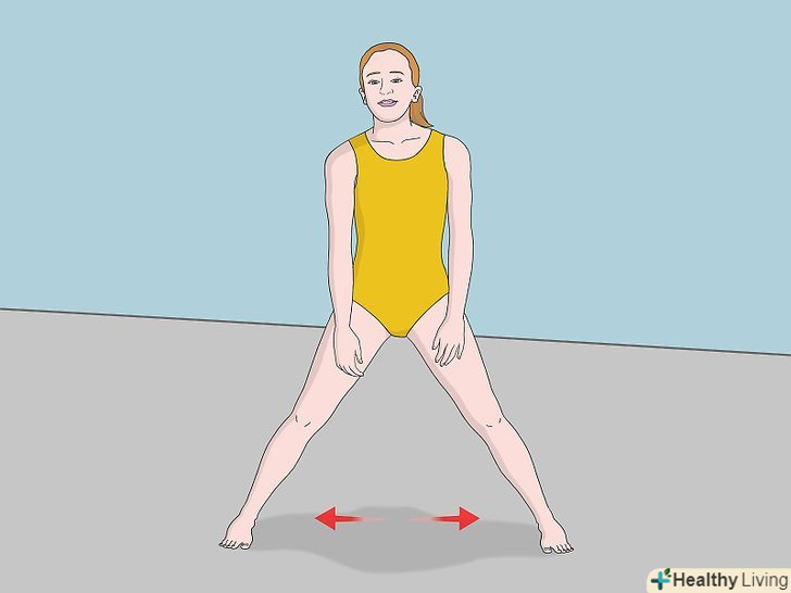Розставте ноги якомога ширше. ця стійка називається «ноги нарізно». Ноги повинні знаходитися не на рівні плечей, а ще далі один від одного. Постарайтеся поставити ноги якомога ширше, при цьому не згинаючи їх в колінах. [12]