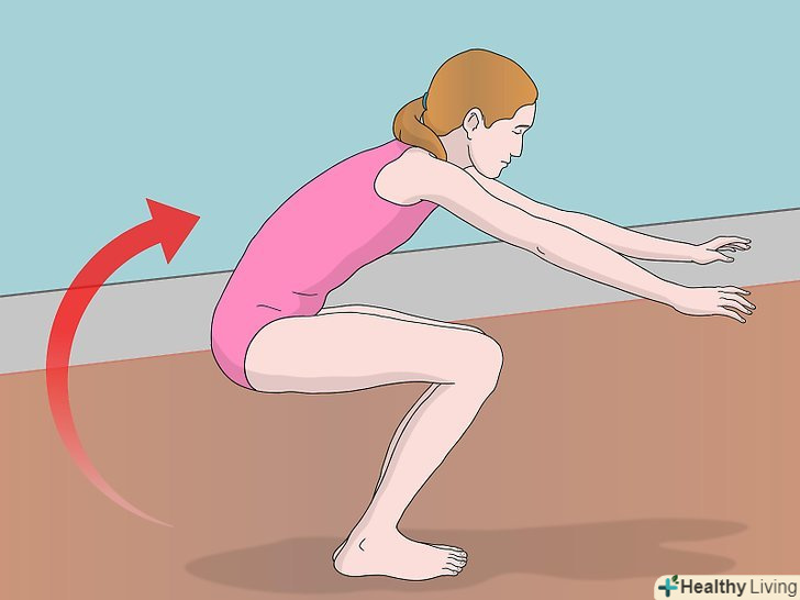 Стрибайте вгору. відштовхніться ногами і випряміть їх. Ви повернетеся у вихідне положення, де ваші ноги і верхня частина тіла будуть випрямленими і при цьому перебувати в повітрі. Як тільки ви почнете рух вгору, махніть руками вперед і вгору для додаткового поштовху. [10]