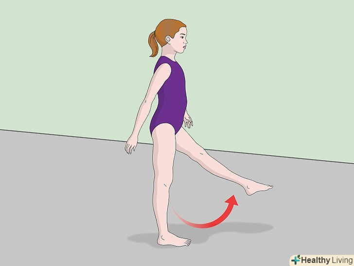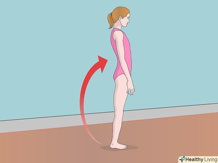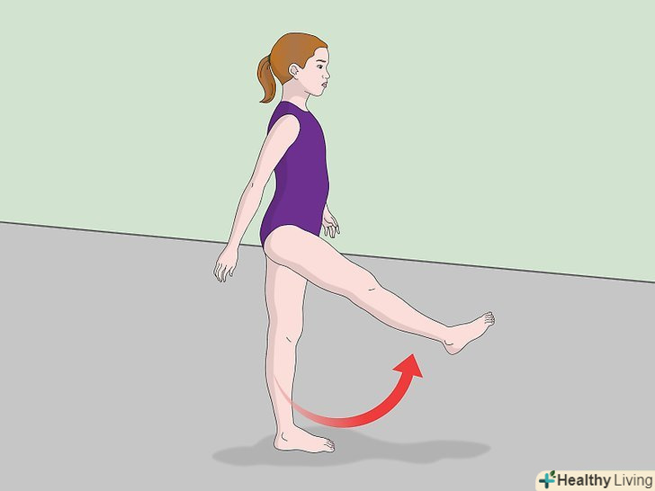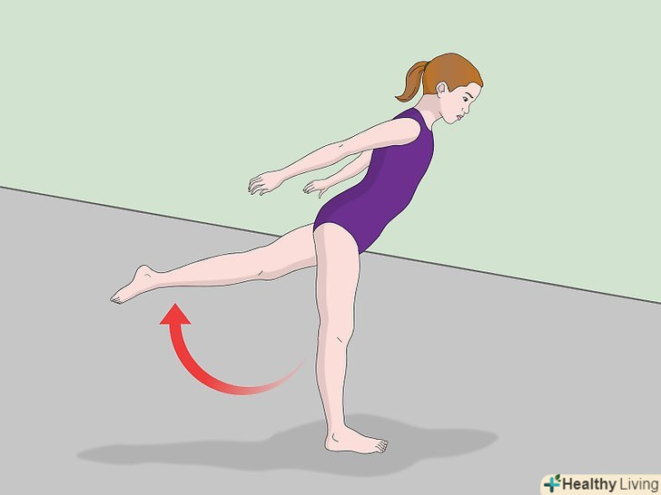 Встаньте на одну ногу. Тримайте опорну ногу і верхню частину тіла прямо.- Мета цієї вправи – навчитися тримати рівновагу. Для того щоб бути хорошим гімнастом, ви повинні вміти управляти своїми м'язами. Дана вправа дозволить вам натренувати цей навик в безпечному середовищі.
