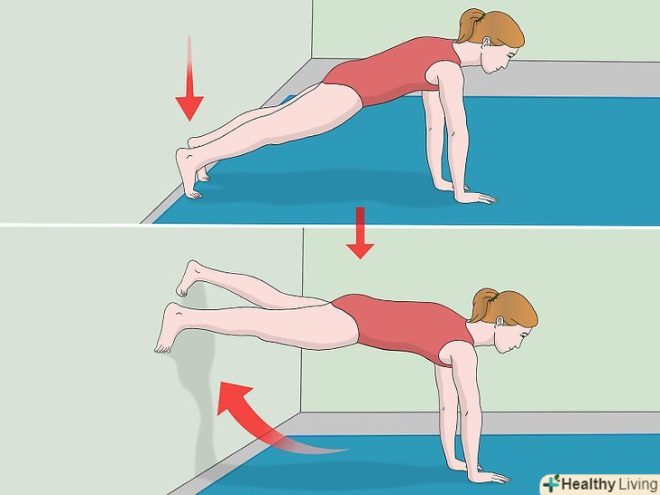 Опустіться вниз і покладіть руки на підлогу. ваші коліна повинні бути зведені разом, а руки – перебувати на ширині плечей. Пальці рук повинні вказувати вперед. [16] притисніть підборіддя до грудей, щоб при виконанні цієї вправи ви не травмувалися . [17]- Виконуйте цей рух тільки на килимку або на іншій м'якій поверхні.