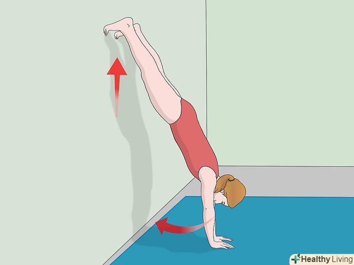 Руками підійдіть до стіни ближче. після того як ви випрямити ноги і ваші пальці будуть спиратися об стіну, прийде пора пустити в справу руки. Спершу пересуньте назад праву руку. Потім вирівняйте ліву руку відносно правої. Повторюйте цей рух до тих пір, поки ваш живіт не опиниться поруч зі стіною або не буде лежати на ній. Ви тільки що виконали просту стійку на руках. [9]