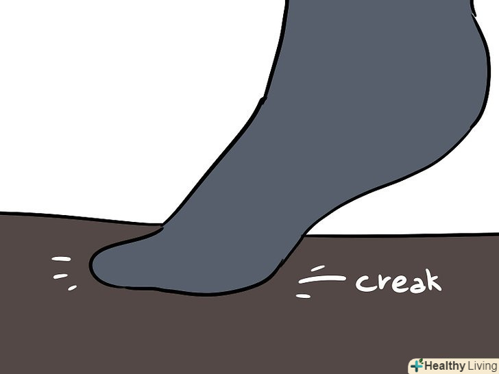 Одягніть щільні шкарпетки, щоб видавати менше шуму. якщо підлога слизька – ходіть босоніж. Не йдіть на носочках, інакше ви будете шуміти в будинку. Одягніть темні тапочки чи черевики.