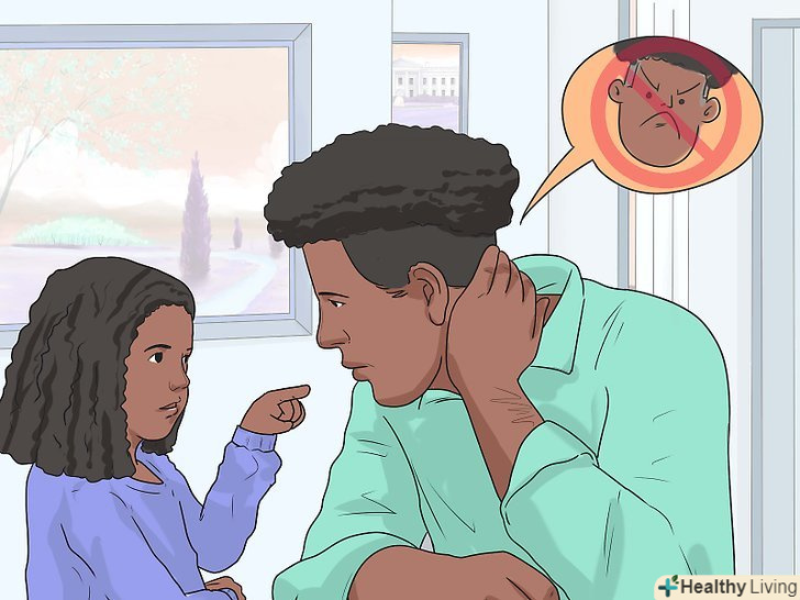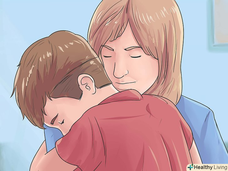 Заспокойте дитину за допомогою фізичних проявів любові. дотик заспокоює нерви, особливо якщо торкається близька і любляча людина. Обійми змушують організм виробляти окситоцин (ця речовина ще називають гормоном близькості). Окситоцин знижує рівень напруги і покращує настрій. [12] якщо дитина засмучений і не може впоратися зі своїми емоціями, намагайтеся якомога більше торкатися до нього, щоб йому стало легше і щоб він зрозумів, що ви готові допомагати йому.- Не намагайтеся під час дотиків обмежувати рухи дитини, оскільки це лише посилить відчуття безпорадності і змусить його думати, що він не може сам вибирати, як поводитися, тому що це за нього роблять інші.