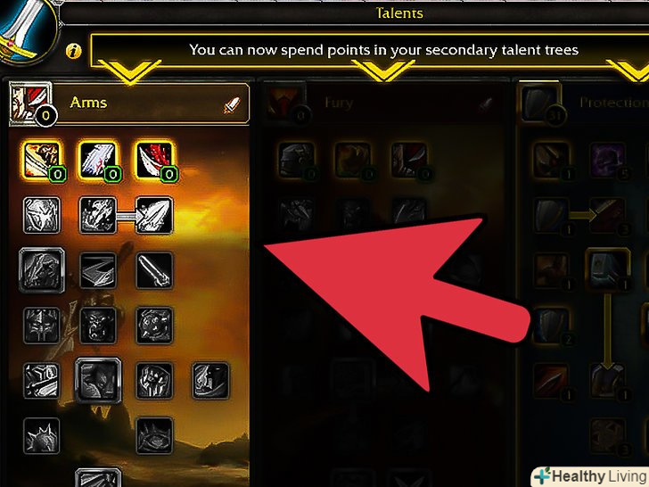 Виберіть гілку талантів:- Зброя-найчастіше використовується в ПВП, але також і в ПВЕ, коли правильно обрані таланти і в поєднанні з шаленством. На низьких рівнях, персонажі з наслідними речами, особливо з дворучним зброєю, можуть вибрати спеціалізацію зброю, так як воїн має велику кількість миттєвих атак, заснованих на втраті зброї, наприклад, перевагу. Швидкість атаки і сила є одними з найкращих характеристик в грі.