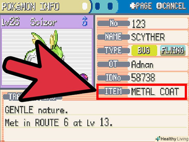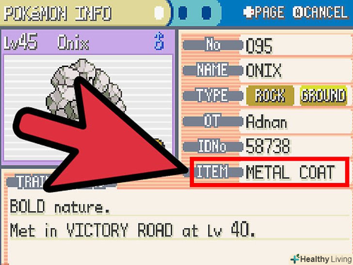 Дізнайтеся, чи потрібен покемону особливий предмет для розвитку.під час обміну покемон повинен тримати особливий предмет, щоб відбулося розвитку. Наприклад, щоб розвинувся Онікс, його потрібно обміняти, давши йому в руки металеве пальто. Щоб розвинути Кланперло, потрібно дати йому водні ваги або водний зуб.