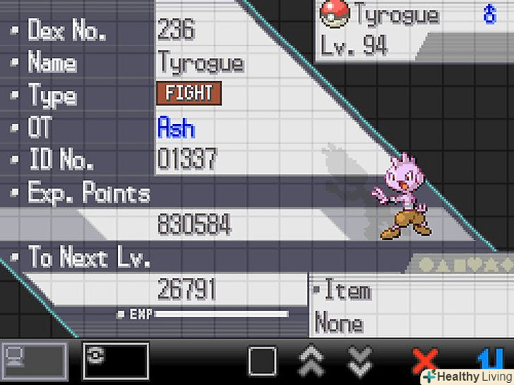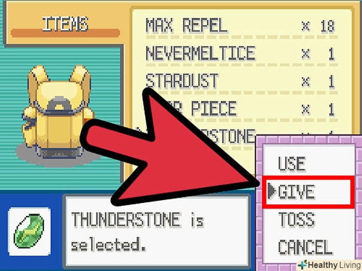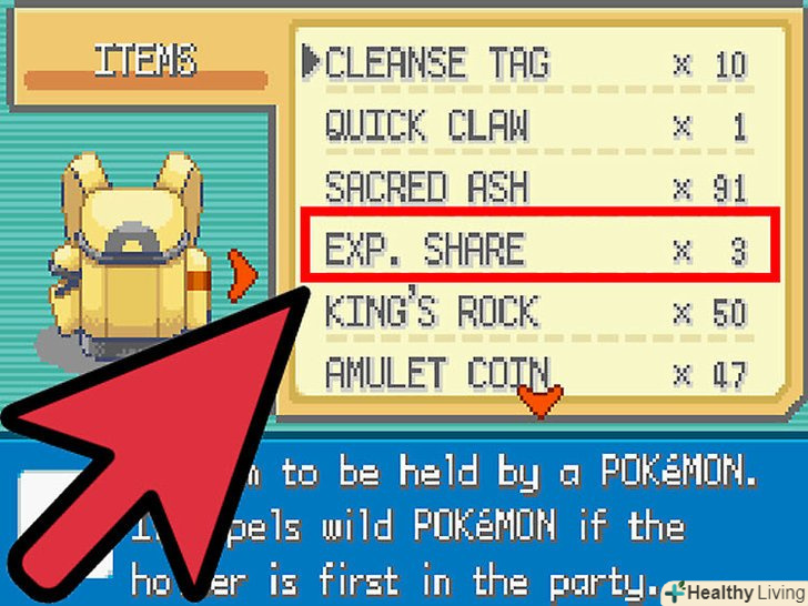Використовуйте спеціальні предмети, наприклад предмет дає вам можливість битися одним покемоном, але ділити досвід між усіма.будь-який покемон, у якого буде такий предмет, буде отримувати досвід за битву, навіть якщо він в ній не брав участь. Якщо ви хочете розвинути певного покемона, але не хочете їм битися, цей спосіб саме для вас.- Зазвичай в грі зустрічаються тільки один такий предмет, але ви можете отримати кілька, якщо обміняєте свого покемона на іншого, у якого є такий предмет. Другий особливий предмет можна отримати у версіях гри Покемон чорний і білий — у голови клубу гри.