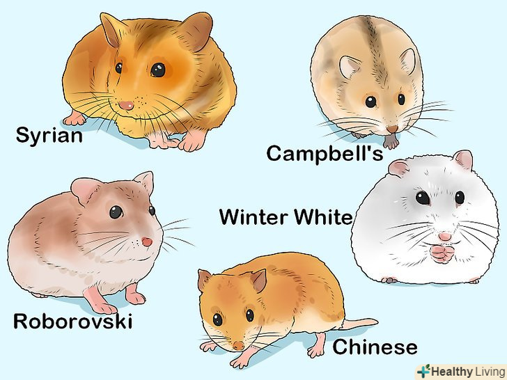 З'ясуйте, який саме вид хом'ячків найбільше вам підходить. можна виділити п'ять основних видів хом'ячків, яких містять в якості домашніх вихованців: Сирійський хом'ячок, хом'ячок Кемпбелла, джунгарський хом'ячок, хом'ячок Роборовського і китайський хом'як. Розмір більшості хом'ячків становить 7,5 - 12,5 см в довжину, проте сирійські хом'ячки більші і можуть виростати до 15-18 см в довжину. Китайські хом'яки і хом'ячки Роборовського довше живуть, а джунгарські хом'ячки і хом'ячки Кемпбелла є карликовими. З урахуванням всіх цих особливостей виберіть собі такого хом'яка, який вам більше підходить! [2]