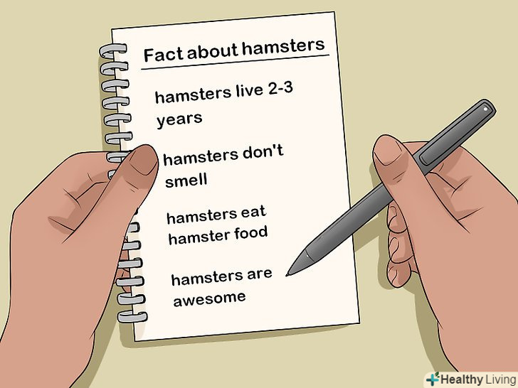 Приготуйтеся відповідати на питання про хом'яків. ймовірно, ваші батьки захочуть дізнатися, як довго живуть хом'яки (2-3 роки), чи пахне від них (ні, вони охайні), чим вони харчуються (спеціальним кормом) та інші практичні моменти. Складіть список відомих вам фактів про хом'яків і тримайте його під рукою, щоб ви могли відповісти на будь-які можливі питання своїх батьків. [3]
