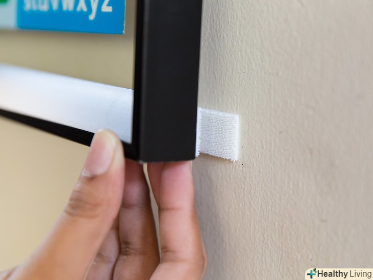 Приліпити другі половинки липучок, призначені для кріплення до стіни на липучки рамки. замість того щоб міряти і вивіряти їх ідеальне розташування на стіні, можна просто приліпити їх до липучок рамки до видалення захисного шару. Після цього можна буде без праці повісити постер на стіну.