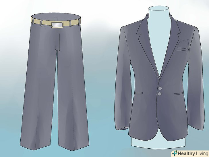 Підберіть відповідні штани. вам знадобляться штани, які будуть ідеально підходити до піджака. Іншими словами ваші штани повинні бути того ж відтінку чорного і з того ж матеріалу, що і піджак.- В ідеалі, якщо ви берете смокінг, на ваших брюках повинні бути атласні лампаси уздовж зовнішніх бічних швів на кожній нозі.