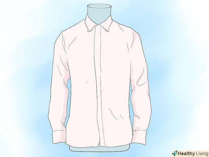 Виберіть собі правильну сорочку. [6] найчастіше підходить однотонна біла сорочка. Для традиційного вбрання потрібна сорочка зі складками. Для сучасного вбрання зупиніть свій вибір на сорочці без складок. Якщо ви не впевнені, що вам сподобається, повіряйте обидва варіанти і тоді вже вибирайте.- Також подумайте над тим, щоб взяти сорочку з манжетами. Манжети на ґудзиках найпростіші, і часто ви бачите їх на будь-яких сорочках з гудзиками. Французькі манжети виглядають більш елегантно.