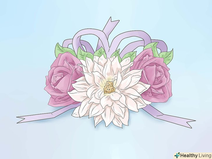 Подумайте над букетом, який кріпиться на руку. Купівля букета лежить на вашому партнері, з яким ви підете на випускний. Так само не забудьте, що ви повинні купити йому бутоньєрку, і в ідеалі, ці дві прикраси повинні гармоніювати.- Ваш букет повинен гармоніювати з кольором вашого сукні, але він не повинен бути того ж відтінку. Спробуйте зробити так, щоб і ваш букет, і бутоньєрка підходили один одному за кольором, вибору квіток і загальному стилю.