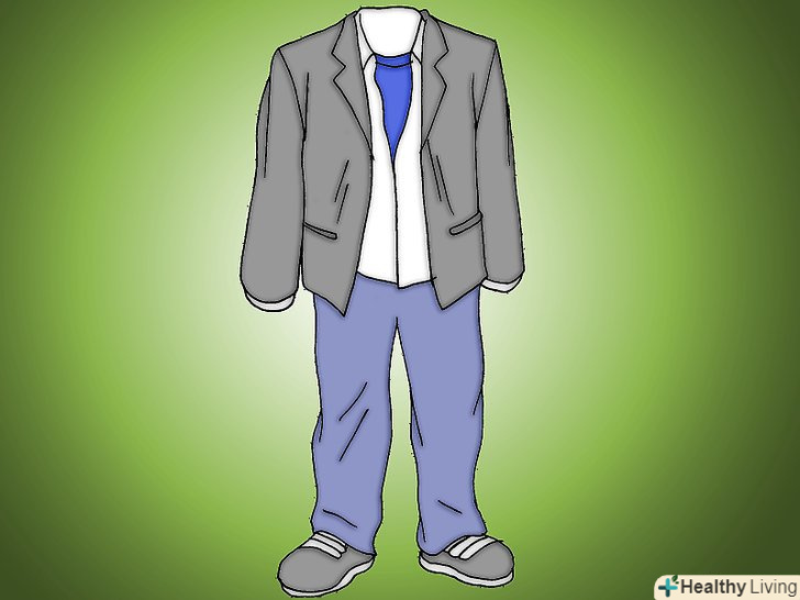 Одяг. одягайте спортивні куртки поверх оксфордських сорочок або футболок з логотипом або дизайном на них. Ніколи не надягайте нарядні штани або взуття; замість цього вибирайте джинси без дірок, але вони можуть бути вільними, і пару тенісних туфель або кросівок. Загальний рза повинен бути завершеним, але все ж дуже повсякденним.