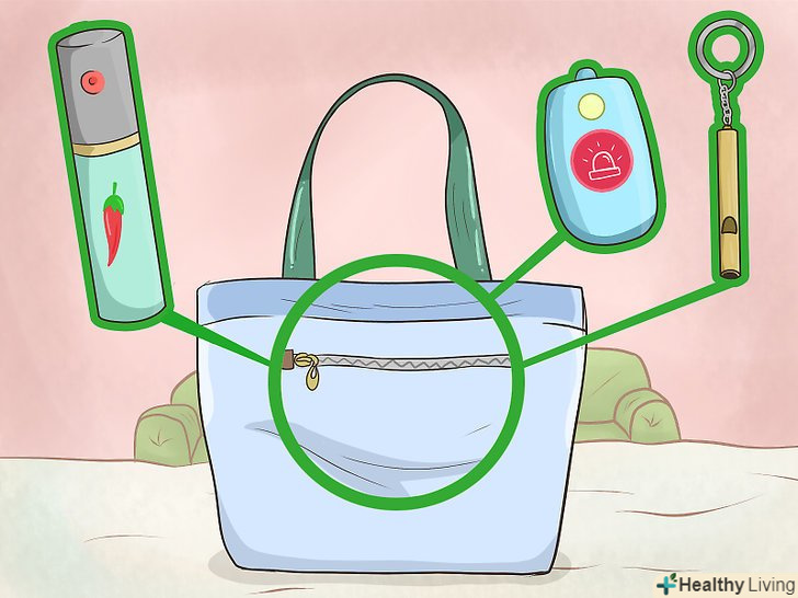 Тримайте засоби безпеки в легкодоступному місці. дамська сумочка — гарне місце для засобів самозахисту, які допоможуть вам подбати про власну безпеку і відчути себе впевненіше. Туди можна покласти балончик з перцевим газом, свисток і навіть персональну тривожну кнопку, за допомогою якої включається сирена. Зберігайте такі речі в надійних, але легкодоступних кишенях сумки, наприклад, в потаємній кишені на блискавці.- Приділіть час вивченню техніки застосування засобів безпеки, перш ніж починати носити їх з собою.