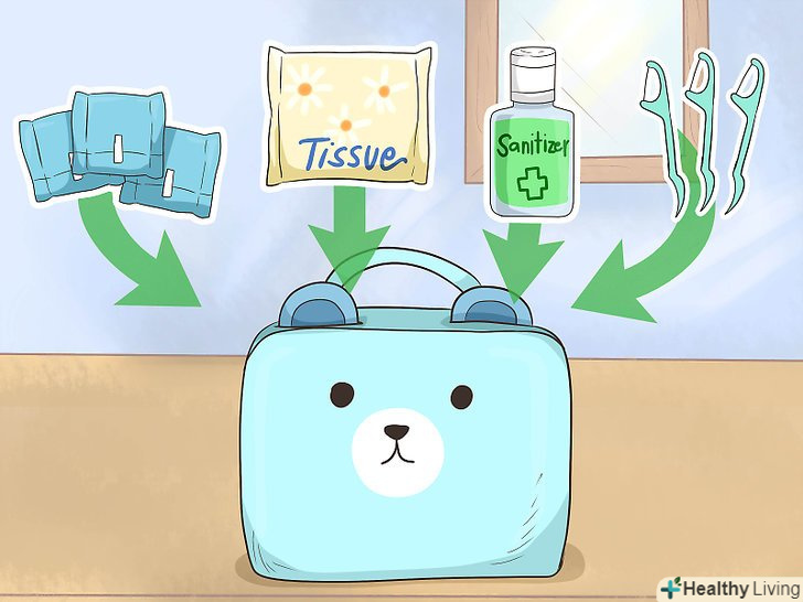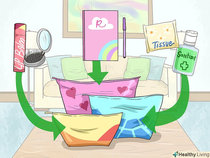 Підготуйте невеликий набір гігієнічних засобів, що включає в себе прокладки, тампони і серветки. придбайте симпатичний органайзер для гігієнічних приладдя в звичайному або інтернет-магазині. Наповніть його тими предметами, без яких не хочете опинитися в найпотрібніший момент. Якщо зберігати їх окремо в органайзері, вони не загубляться всередині сумочки і не випадуть. [1]Покладіть в органайзер для гігієнічних приладдя наступні предмети: