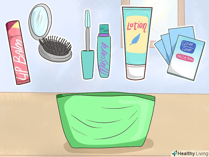 Підготуйте маленьку косметичку, поклавши всередину лосьйон, гігієнічну помаду і необхідну косметику. якщо Ви користуєтеся косметикою, корисно буде носити з собою кілька основних косметичних засобів, щоб у вас була можливість поправити макіяж протягом дня. Якщо вам не потрібно нічого, крім пари речей, таких як туш і помада, їх можна помістити в органайзер для гігієнічних приладдя. В іншому випадку підготуйте окрему косметичку, щоб підтримувати порядок в сумочці. [2]Покладіть в косметичку: