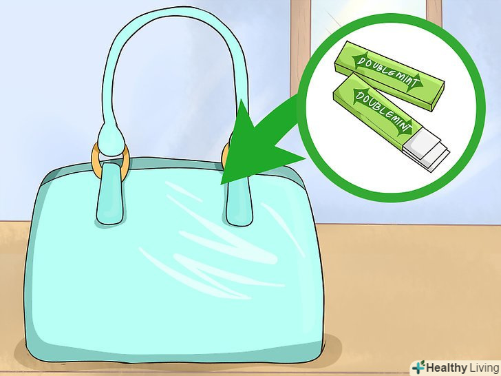 Покладіть в сумку жувальну гумку або м'ятні драже для свіжості дихання. так вам не доведеться переживати про неприємний запах з рота протягом дня. Застосовуйте жуйку або м'ятні драже відразу після вживання їжі або в ті моменти, коли хочете позбутися неприємного присмаку в роті. [5]- У більшості навчальних закладів не схвалюється використання жувальних гумок, тому якщо ви готуєте сумку, з якою будете відвідувати заняття, краще візьміть з собою м'ятні драже.