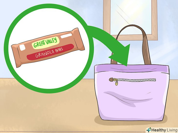 Якщо ви збираєтеся досить довго перебувати поза домом, прихопіть з собою що-небудь перекусити. ніколи не завадить прихопити з собою пару упаковок готових їстівних припасів, щоб підтримати себе протягом дня! Зупиніть свій вибір на невеликих упакованих продуктах, таких як зернові батончики або пакетики з горіхами або соломкою. Також можна самостійно упакувати продукти в пакет із застібкою, тільки обов'язково щільно його закрийте, щоб вміст не розсипалося по всій сумці.- Крихти можуть дуже швидко накопичитися у вашій сумочці, тому обов'язково своєчасно витрушуйте з сумки весь харчовий сміття.