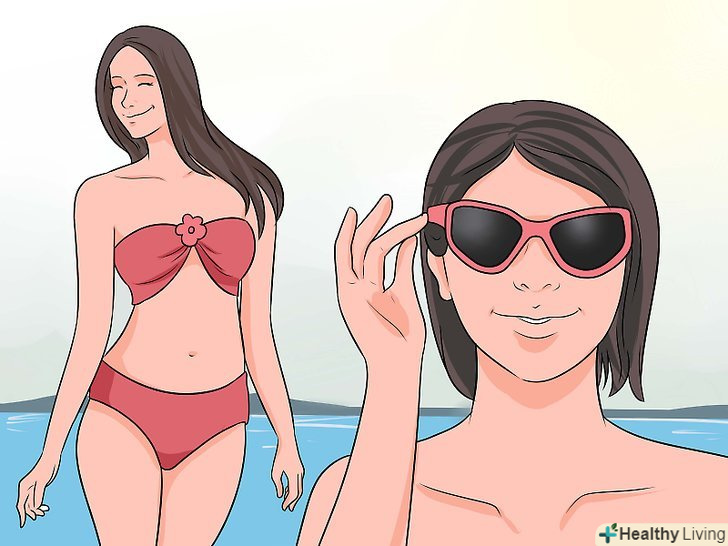 Одягайтеся жіночно і симпатично для басейну. одягніть рожевий купальник і парео на пляж, а також підберіть сандалі під купальник. Бантики в волоссі і симпатичні сонцезахисні окуляри допоможуть завершити образ.
