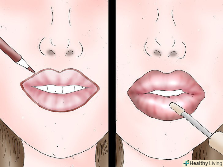 Зробіть губи повніше. губи Анджеліни пухкі від природи. Якщо у вас вони не такі, ви не будете виглядати як вона. Хоча є кілька трюків, як зробити губи більш пухкими.- Використовуйте світло-коричневий олівець для губ, для того, щоб трохи їх збільшити, вийдете за контури губ. Потім нанесіть на губи помаду натурального кольору або блиск для губ. Ви можете пофарбувати центр губ кольором світліше основного тону, щоб форма губ була більше схожа на її форму.