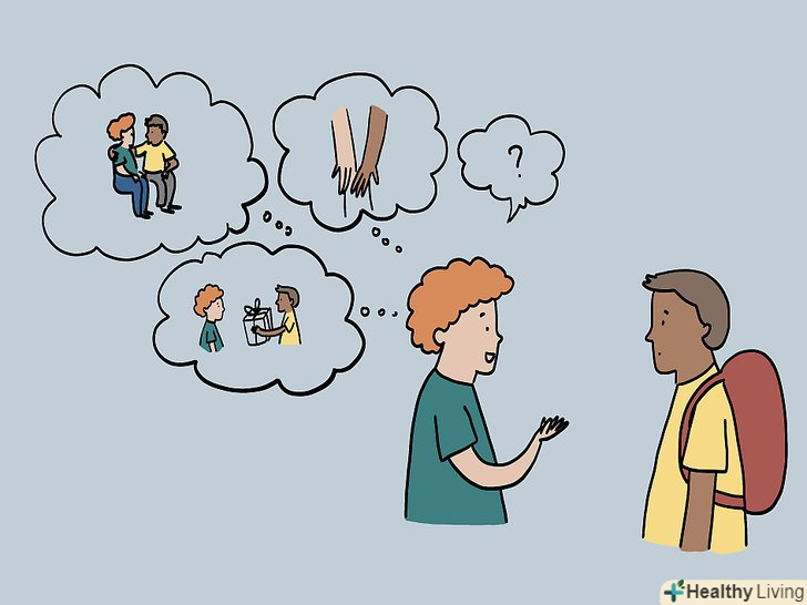 Зверніть увагу на спроби дотиків. Якщо ви подобаєтеся хлопцю, він знайде будь-який привід для фізичного контакту. Можливо, він грайливо відштовхує вашу руку, коли намагається пожартувати, легко підштовхує ліктем, щоб привернути увагу, грає з вашим волоссям або торкається плечем плеча, коли проходить мимо. Всі ці ледь вловимі ознаки можуть вказувати на бажання стати трохи ближче до вас! [2]- Якщо ви подобаєтеся хлопцю, він буде намагатися торкатися до вас в дружній манері, щоб не завдавати незручностей. Якщо його дії завдають вам біль або змушують вас відчувати дискомфорт, попросіть його припинити або зверніться до дорослих за допомогою.