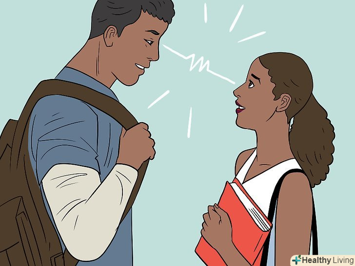 Щоб якось почати спілкування і встановити контакт, подивіться йому в очі. не потрібно відверто витріщатися на нього, просто подивіться йому в очі і затримайте погляд на пару секунд — так, будемо сподіватися, ви привернете його увагу і будете виглядати в його очах впевненіше. [13]- Якщо ваш колишній приятель або хлопець, який вам подобається, зловить ваш погляд, спробуйте утримати його на пару секунд, потім посміхніться і відведіть погляд.